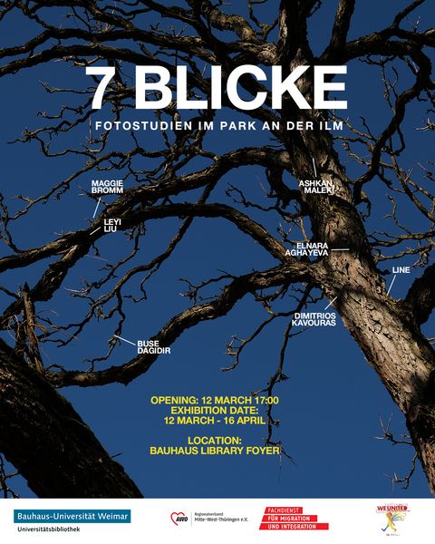 "7 BLICKE" (7 VIEWS) presents the photographic journeys of seven fellow Bauhaus students from the "Mittendrin" project (AWO). Led by artist Narmin Zey, these creators captured their personal process of "arriving" in Weimar, transitioning from the sharp lines of the campus into the organic beauty of Park an der Ilm.