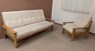 Biete Couch und Sessel mit Holzgestell in gutem Zustand, Maße Couch L 185cm, Sitzlänge 168cm, Sitztiefe 50cm, Sitzhöhe 42cm. Sessel Gesamtbreite 72cm, Sitztiefe 50cm. Höhe wie Couch. Lässt sich leicht zerlegen. Müsste selbst abgeholt werden. Preis zusammen 220€.