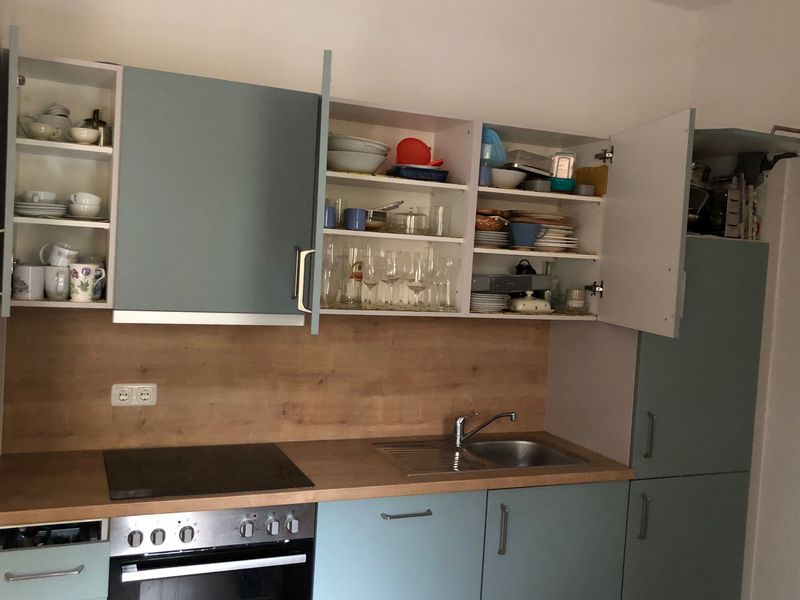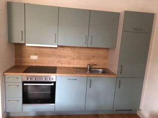 Küche ist aus 2022, beinhaltet Schränke, Geschirrspüler, Backofen, Kühlschrank mit Gefrierfach und Spüle.