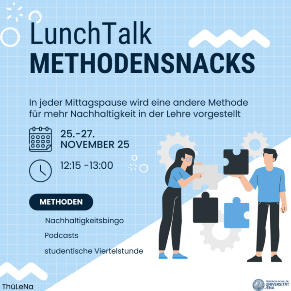Vom 25. bis 27. November 2025 werden an drei Tagen jeweils von 12:15 bis 13:00 Uhr jeweils eine Methode kompakt und praxisnah vorgestellt, die Studierende aktivieren und Nachhaltigkeit ins Lehrgeschehen integrieren.