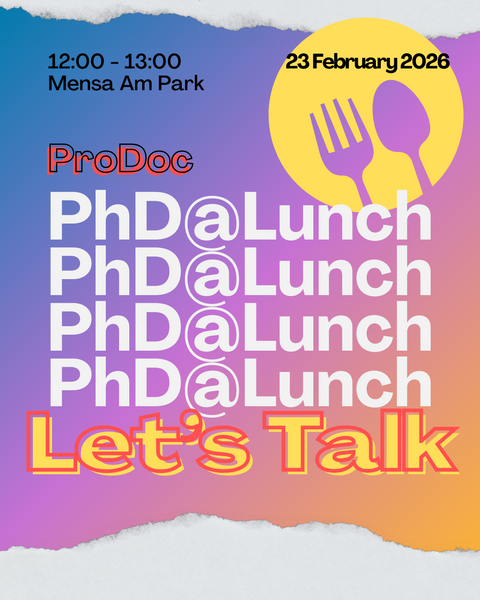 Are you a doctoral candidate looking to exchange with others? Would you like to gain insights into the Pro.Doc programme or simply talk about everyday life as a doctoral candidate? If so, we invite you to our open lunch meeting. Our next PhD@Lunch event will take place on: