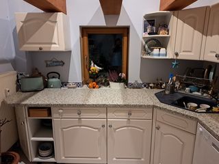 Die Wohnung liegt im 3. Stock, hat ein großes Wohnzimmer ausgestattet mit Esstisch, Schreibtisch, Fernseher, Sofa und einem Doppelbett. Es gibt auch einen Schlafboden, der ggf. mitgenutzt werden kann. Bad mit Wanne, Küche mit Zugang zur Dachterasse und Blick über Weimar.