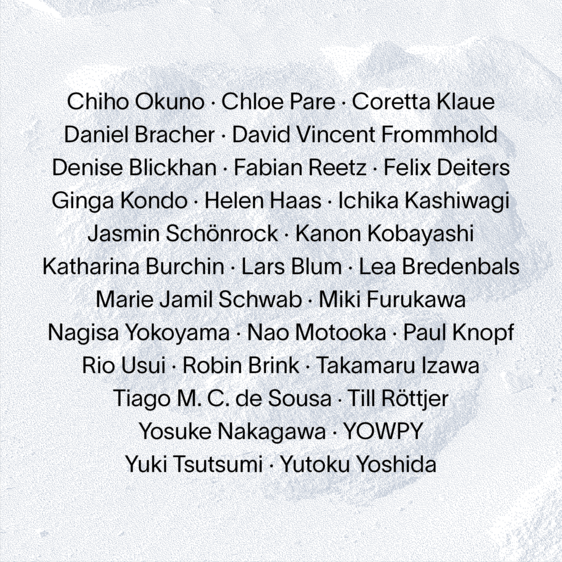 Chiho Okuno, Chloe Pare, Coretta Klaue, Daniel Bracher, David Vincent Frommhold, Denise Blickhan, Fabian Reetz, Felix Deiters, Ginga Kondo, Helen Haas, Ichika Kashiwagi, Jasmin Schönrock, Kanon Kobayashi, Katharina Burchin, Lars Blum, Lea Bredenbals, Marie Jamil Schwab, Miki Furukawa, Nagisa Yokoyama, Nao Motooka, Paul Knopf, Rio Usui, Robin Brink, Takamaru Izawa, Tiago M. C. de Sousa, Till Röttjer, Yosuke Nakagawa, YOWPY, Yuki Tsutsumi, Yutoku Yoshida