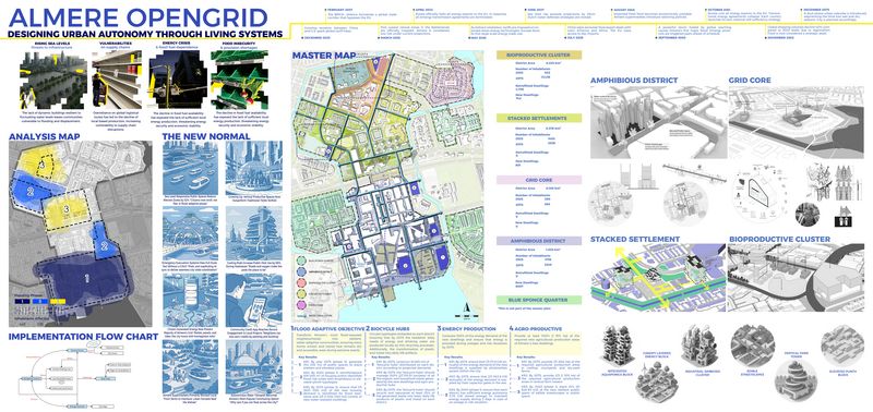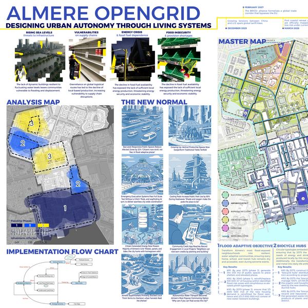 This project envisions how Almere could develop by 2075 while accommodating an additional 15,000 dwellings. We imagined a future where the city faces flooding, driven by climate change and political instability that limits access to essential resources. In response, we developed the concept of a self-sufficient city focused on three key themes: local food production, sustainable energy generation, and effective waste management.
