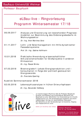 Im zweimonatigen Rhythmus lädt die Professur Bauphysik Forscher und Praktiker aus verschiedenen Bereichen der Bauphysik zu einer öffentlichen live-Veranstaltung ins virtuelle Klassenzimmer ein. Die Veranstaltungen bestehen aus einem halbstündigen Vortrag mit anschließender Diskussion.