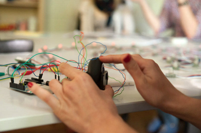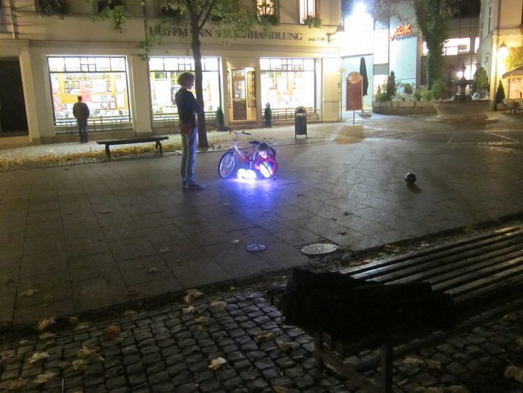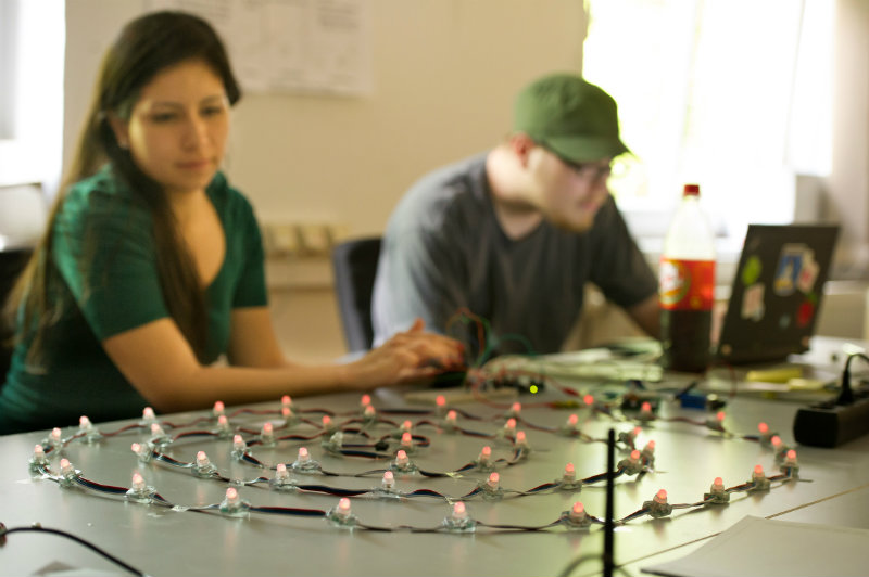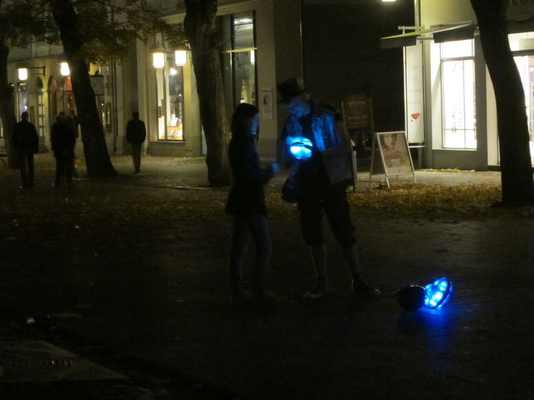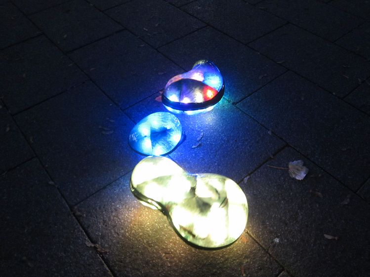 Am Ende sollten nicht nur die menschlichen Füße mit den Figuren interagieren, auch die Formen untereinander sollten »kommunizieren« können. Die unterschiedlichen Elemente sollten wie einzelne Charaktere quasi emotional reagieren. Jede Form gibt jeweils eigene Outputs. Berühren sich beispielsweise zwei von ihnen, blinken sie schneller oder erzeugen ein spezifisches Geräusch. Passanten sollen sich dadurch spielerisch mit den Figuren auseinandersetzen – anstubsen, staunen, ausprobieren.