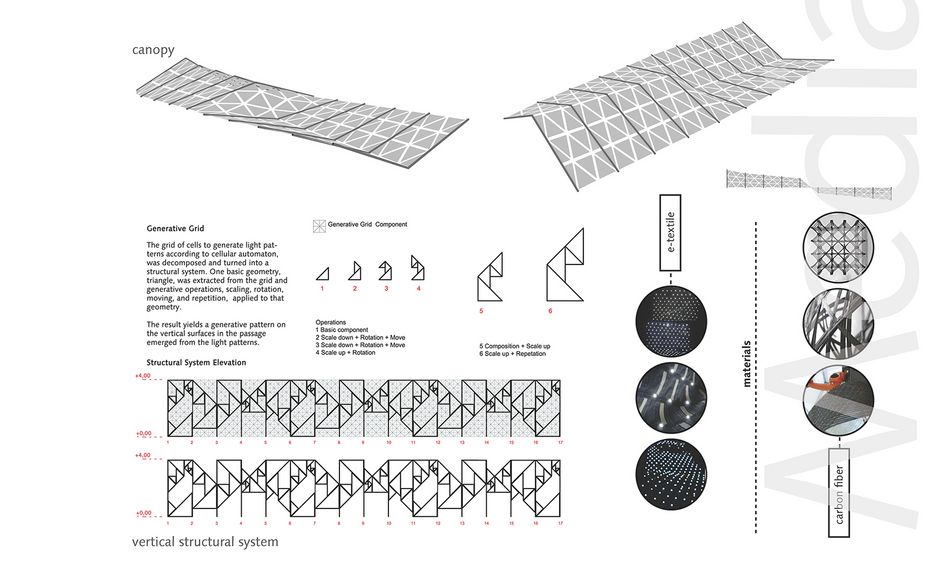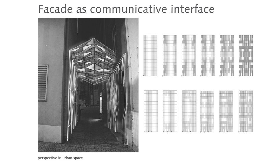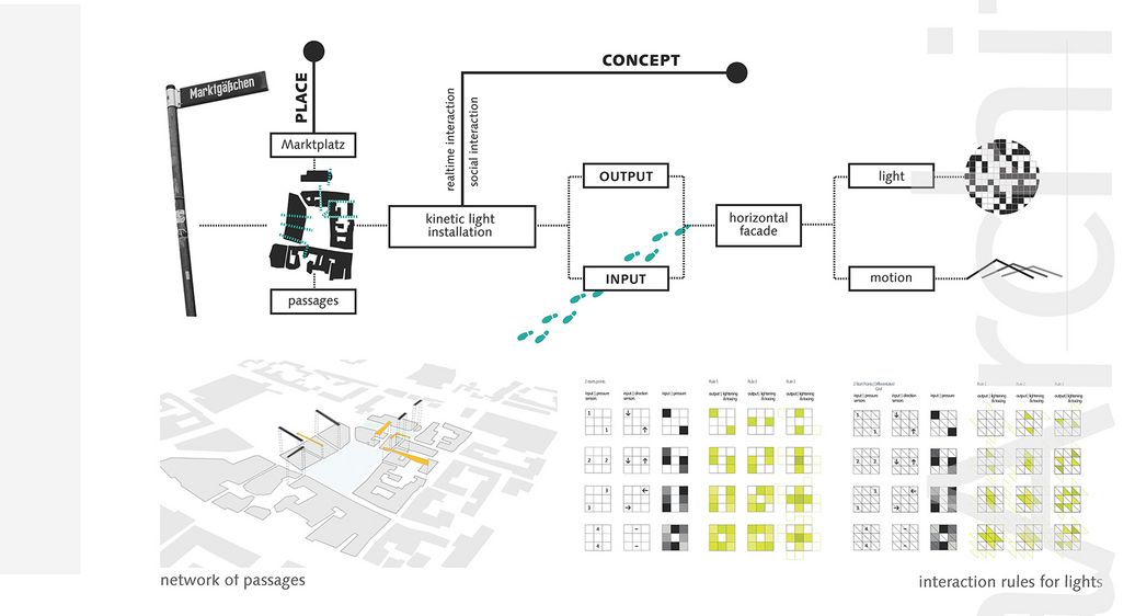 With Marktplatz being our starting point, we were inspired by the experience of walking through the narrow alleys and passages around the square. After observing passers-by using this spaces, the idea of tracking their movement and behaviour was born. Our aim is to translate this invisible information into a physical interface with the medium of light. The objective is to create a generative experience that is based on public participation and social interaction. The kinetic light installation will be placed in different passages, creating a network of light structures, that will illuminate this unique places and at the same time reveal their usage. Our target group is the passers-by who frequently (or not) use these ways. While the goal is to create a fluid public condition which is programmed by their presence and social interaction. The installation can also work as an attractor for new users and create new circulation patterns.