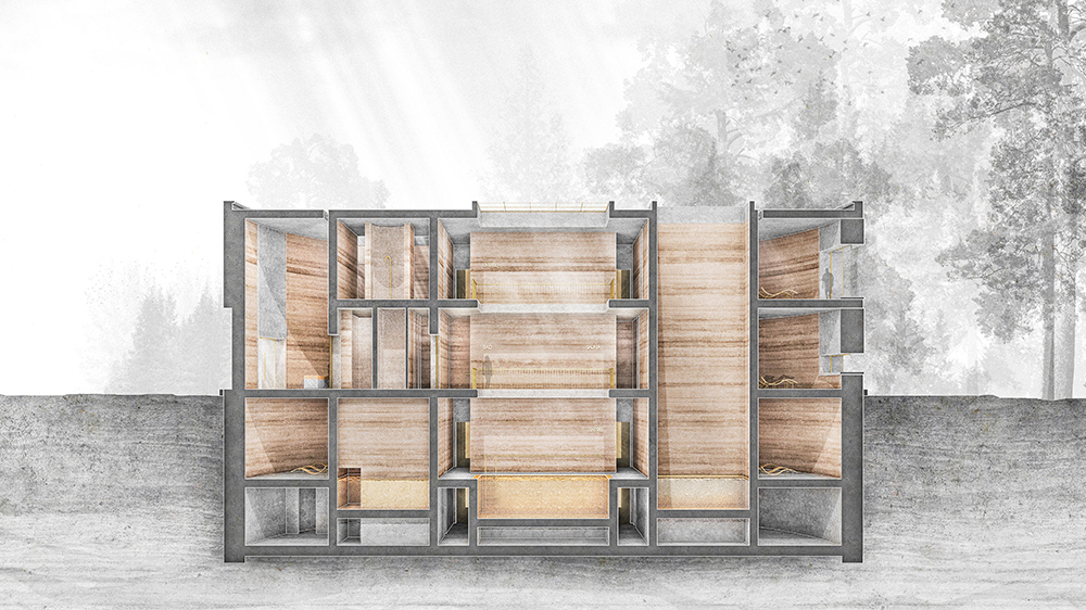 Der Entwurf soll die Erinnerung an einen ganz bestimmten Ort hervorrufen. Er soll diesen Ort reflektieren, aber auch versuchen ihm eine neue Identität zu geben. Es soll ein Gebäude entstehen, das mit der Geologie des Ortes korrespondiert. Die Baltische Ostseeküste ist durch viele Besonderheiten geprägt, wie das Naturschutzgebiet der Kurischen Nehrung, mit wandernden Dünenlandschaften und Kiefernwäldern, Hochmoorgebieten oder auch die Vergangenheit als ein königliches Ostsee- und Moorbad in Ostpreußen. Vor allem aber ist der Bernstein und sein in dieser Region weltweit größtes Vorkommen eines der Wahrzeichen dieser Region.