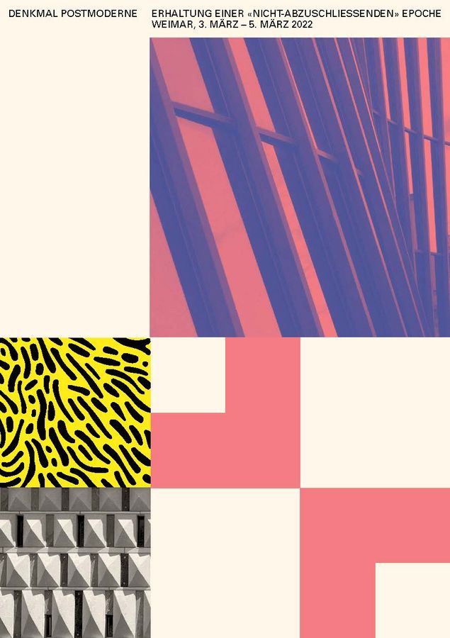 DENKMAL POSTMODERNE ist eine gemeinsame Tagung der Bauhaus-Universität Weimar (Professur für Denkmalpflege und Baugeschichte, Prof. Dr. Hans-Rudolf Meier) und der ETH Zürich (Professur für Konstruktionserbe und Denkmalpflege, Prof. Dr.-Ing. Silke Langenberg) mit Unterstützung der Wüstenrot-Stiftung.