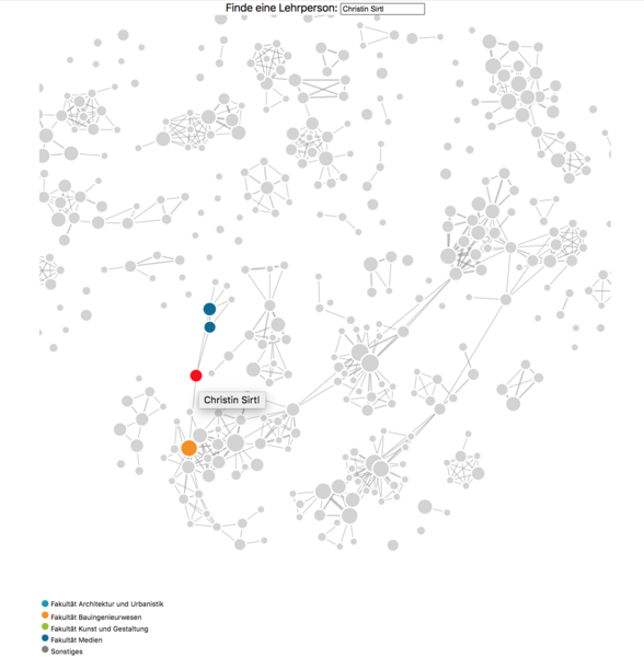 Viele der Lehrenden der Bauhaus-Universität Weimar kooperieren mit Kolleg*innen beim Unterrichten von Kursen. Mithilfe von »BisonWatch« lassen sich diese Kooperations-Netzwerke von Lehrenden in Form einer Graphik anzeigen (siehe Abbildung 2). Dabei werden die einzelnen Lehrenden als Kreise dargestellt. Kooperationen zwischen Lehrenden wiederum werden durch Strichverbindungen zwischen den einzelnen Kreisen angezeigt. Je größer der Kreis ist, desto mehr direkte oder indirekte Verbindungen hat die dadurch repräsentierte Lehrperson zu anderen Lehrenden. Anhand der Farbe des Kreises lässt sich auf einen Blick erkennen, welcher Fakultät die jeweiligen Lehrenden angehören. Die Suchfunktion von »BisonWatch« erlaubt es Nutzer*innen überdies, Lehrpersonen nach Namen zu suchen und sich deren Netzwerke und Kurse anzeigen zu lassen.
