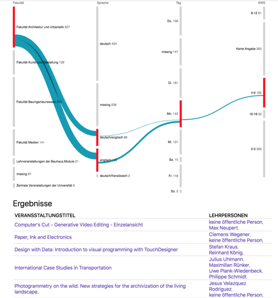 Das Online-Tool visualisiert die gesuchten Kurse auf zweierlei Weise: Einerseits werden die Kurse, die den ausgewählten Kriterien entsprechen, als bunte Linie dargestellt — je dicker die Linie ist, desto mehr Kurse gibt es, die der Suchanfrage entsprechen. Anderseits erscheint unterhalb der Graphik eine Übersicht der entsprechenden Kurse mit Veranstaltungstitel und den Namen der jeweiligen Lehrpersonen. Ein Mausklick auf den Veranstaltungstitel bringt die Nutzer*innen zur Kursbeschreibung im »Bison«-Serviceportal. Durch Klicken auf die Namen der jeweiligen Lehrenden wiederum lassen sich die Lehrkooperationsnetzwerke dieser Personen an der Bauhaus-Universität anzeigen.