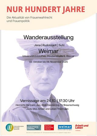 Die Ausstellung »Nur hundert Jahre – Zur Aktualität von Frauenwahlrecht und Frauenpolitik« macht seit 2. Oktober Station in Weimar und lädt noch bis 9. November dazu ein, die Geschichte des Frauenwahlrechts neu zu entdecken und ihre Bedeutung für die Gegenwart zu reflektieren. Im Mittelpunkt der Ausstellung stehen Biografien von Frauen, die zwischen 1919 und 1933 in Gemeinderäten und sog. Stadtparlamenten wirkten – eine Perspektive, die bislang nur wenig Beachtung fand.