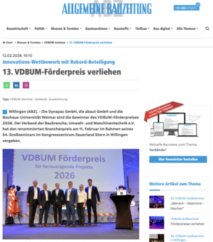 Die Dynapac GmbH, die abaut GmbH und die Bauhaus-Universität Weimar sind die Gewinner des VDBUM-Förderpreises 2026. Der Verband der Baubranche, Umwelt- und Maschinentechnik e.V. hat den renommierten Branchenpreis am 11. Februar im Rahmen seines 54. Großseminars im Kongresszentrum Sauerland Stern in Willingen vergeben.