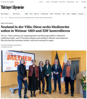 Am 11. Februar 2026 ist der neu eingerichtete Medienrat erstmals zusammengetreten. Vorgestellt wurde er in der Medienvilla der Bauhaus-Universität Weimar. Dem Gremium gehören sechs Fachleute aus Wissenschaft, Medien und Politik an: Prof. Dr. Anne Bartsch, Prof. Dr. Jeanette Hofmann, Prof. Dr. Annika Sehl, Nathalie Wappler, Prof. Dr. Boris Alexander Kühnle und Peter Müller.