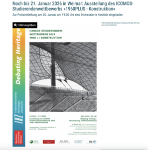 Eine Ausstellung im Hauptgebäude der Bauhaus-Universität Weimar zeigt die Ergebnisse des ICOMOS-Studierendenwettbewerbs 1960PLUS sowie Arbeiten eines Seminars an der Professur Denkmalpflege und Baugeschichte aus dem Sommersemester 2025 zum Thema »Konstruktionserbe 1960PLUS«. Zudem findet am 20. Januar 2026 im Rahmen der »Debating Heritage«-Reihe des Internationalen Heritage-Zentrums die Preisverleihung an die prämierten Teilnehmenden des international ausgeschriebenen Wettbewerbs sowie ein Abendvortrag statt.