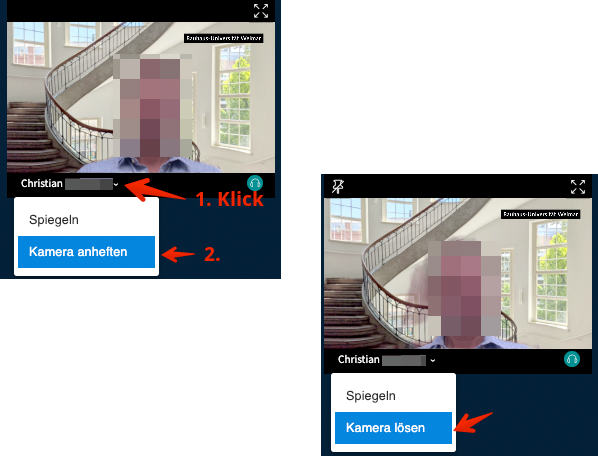 Wenn viele Webcams in einem Meeting genutzt werden, können Sie bestimmte Webcams anheften, so dass Sie diese immer an gleicher Stelle sehen. Die Einstellung kann wieder rückgängig gemacht werden (Webcam lösen).