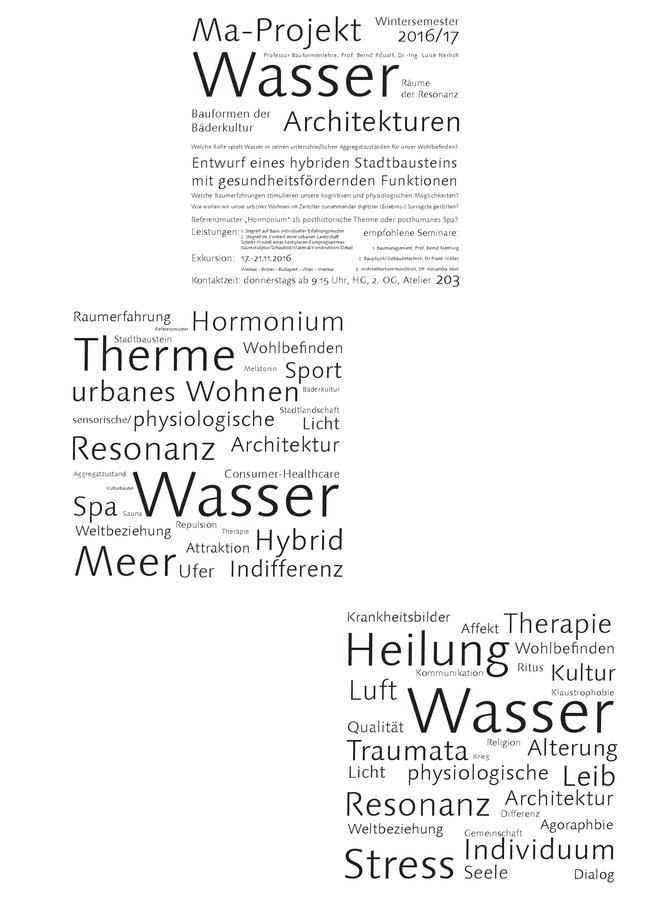 WASSERARCHITEKTUREN fassen das fluide Medium mittels adäquater architektonischer Gesten unterschiedlicher Gebrauchmuster. Wasser als Ursprung des Lebens und lebensnotwendige Ressource wurde in allen kulturellen Epochen mit spezifischen Bauformen thematisiert - von der Einfassung (heiliger-) Quellen über Brunnen und Aquädukte bis zur Therme als höchsten Ausdruck (Römischer) Bäderkultur. Aktuelle Wellnesskonzepte zur Stimulierung des menschlichen Wohlbefindens suchen Anschluss an historische Erfahrungen in der Nutzung verschiedener Aggregatzustände vom Dampf/Schwitzbad über das temperierte Massagebad bis zum Kältebad im Tauchbecken oder der Eisgrotte. In der Metapher des Gesundbrunnens verkörpert sich unter anderem der ein physiologisch wirksamer Bezug zur medizinische wirksamen, therapeuthischen Anwendung des Wassers. Endokrine Prozesse werden dabei im Idealfall durch äußere Einwirkungen gesundheisfördernd stimuliert. Im Zusammenhang mit einem allgemeinen Trend gesundheisbewußter Lebensführung zu Gunsten selbstbestimmten und altersgerechten Wohnen gewinnt der Aspekt von Umgebungen für das Wohlbefinden eine deutliche Aufwertung. Bis auf wenige Ausnahmen sind dafür jedoch noch keine zeitgemäßen adäquaten Bauformen entstanden, die ihren historischen Vorbildern nahekommen. Diese architekonische Lücke gilt es zu füllen ohne die stereotypen Muster von Spa-Hotel-Oasen zu zitieren. Statt dessen dienen zunächst individuelle und gemeinschaftliche Raum- und Naturerfahrungen als Inspirationsquelle und Referenmuster für eine psychologisch und physiologisch wirksame Architektur.