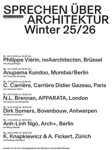 Auf Einladung der Professuren des architektonischen Entwerfens stellen Architektenkollegen Auszüge Ihres Werkes vor. Anschließend sprechen die Einladenden und ihre Gäste dann über das, was sie in der Architektur antreibt, was sie in ihrem Schaffen bewegt. Das offene Gespräch zwischen zwei entwerfenden Kollegen eröffnet den Zuhörern Einblicke in das Denken beider, in das des Gastes natürlich, aber auch in das Denken des Einladenden.