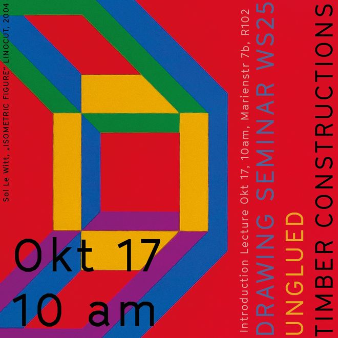 Im Seminar „Unverleimte Holzkonstruktionen“ geht es um das Fügen von Holzbauteilen zu Trägern, Stützen und Wänden. Holzbauteile, die nicht verleimt werden, können direkt vom Ort kommen, industrielle Schritte, lange Transportwege und großer Energieaufwand können so vermieden werden. Die mögliche und heute nötige Auseinanderbaubarkeit und Wiederverwendung der Einzelteile stehen im Fokus und es sollen Rückschlüsse auf sinnvolle Verbindungsweisen gezogen werden. Referenzen aus der Architekturgeschichte werden analysiert, die Ergebnisse mit einem*er Tragwerksplanerin der Kreislaufplanung besprochen und Schlussfolgerungen für das Bauen von heute formuliert. Produkt des Seminars sind Handzeichnungen oder Drucke auf DinA1. Es werden farbige, flächige Darstellungen erprobt, in denen die Einzelteile, Fügungen und daraus folgende Raumkonstruktionen zum Ausdruck kommen. Das Seminar ist als Entwurfsvorbereitung für das SoSe26 gedacht und findet in Blockterminen statt.