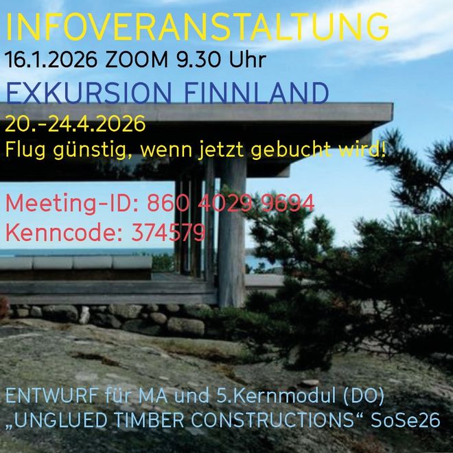 Im SoSe26 bieten wir den Entwurf „Unglued Timber Constructions“ als MA Entwurf und 5. Kernmodul an. Wir möchten in Thüringen Hallenbauten für ein Sägewerk, eine Saatgutanlage und ein Schwimmbad aus unverleimten Holzkonstruktionen entwerfen. Wichtiger Fokus wird dabei auf kurzen, rechteckigen Teilen oder ganzen Stämmen und der Auseinanderbaubarkeit der Verbindungen liegen. Dazu möchten wir eine Exkursion nach Finnland machen, und vorrangig Aalto und Siren Architekturen mit sparsamen Holzkonstruktionen der Nachkriegsmoderne anschauen. Die Flüge sind am günstigsten, wenn wir im Januar buchen. Deswegen bieten wir eine Voranmeldung für Entwurf und Exkursion jetzt schon an.