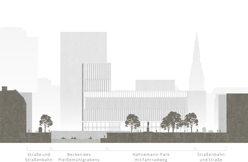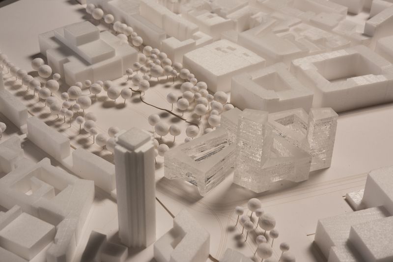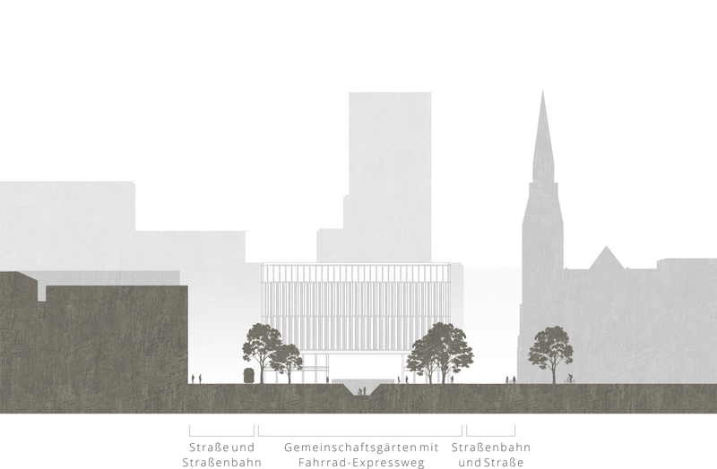 Die in einzelne Fahrspuren geteilte Straße definiert die äußere Kubatur und bildet zusammenhängende Freiflächen. Passagen teilen das Volumen in drei separate Baukörper und verbinden den Innenstadtbereich mit den äußeren Bezirken.