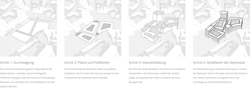 Die Positionierung der Baukörper bildet neue gefasste Stadtplätze. Das Einrücken der Volumina erzeugt vor den Hochpunkten der Baukörper kleine Vorplätze.