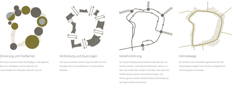 Die neuen Volumina teilen die Ringfigur in klar gefasste Bereiche. Stadtplätze und Grünflächen mit unterschiedlichem Charakter wechseln sich ab.