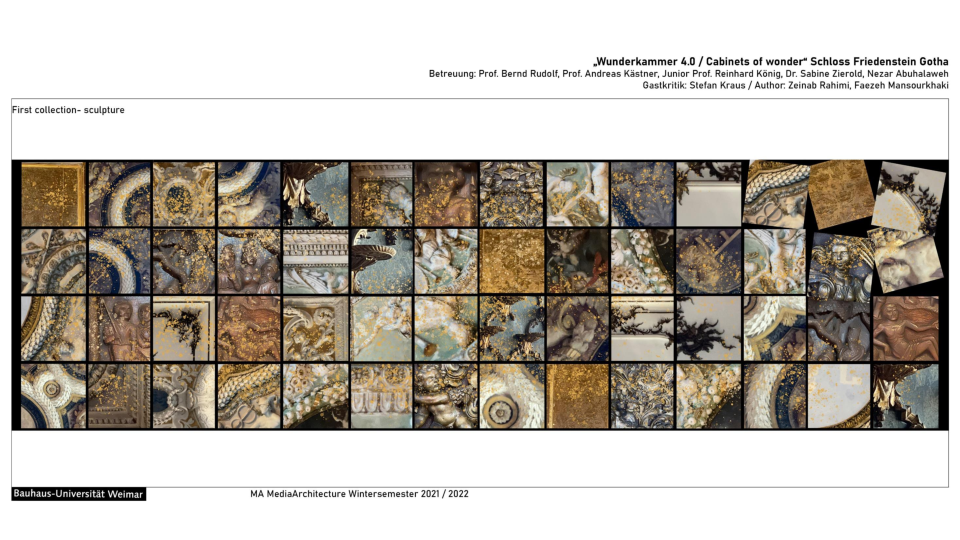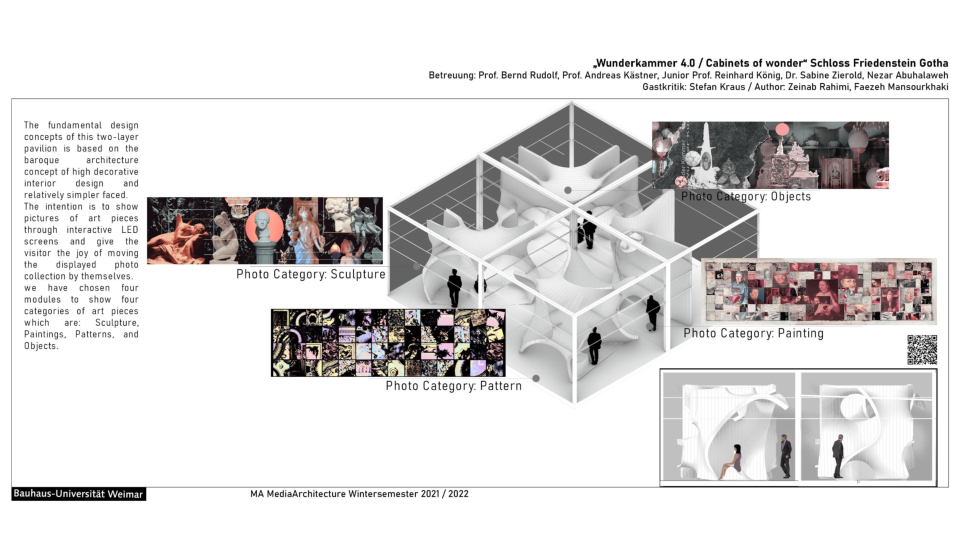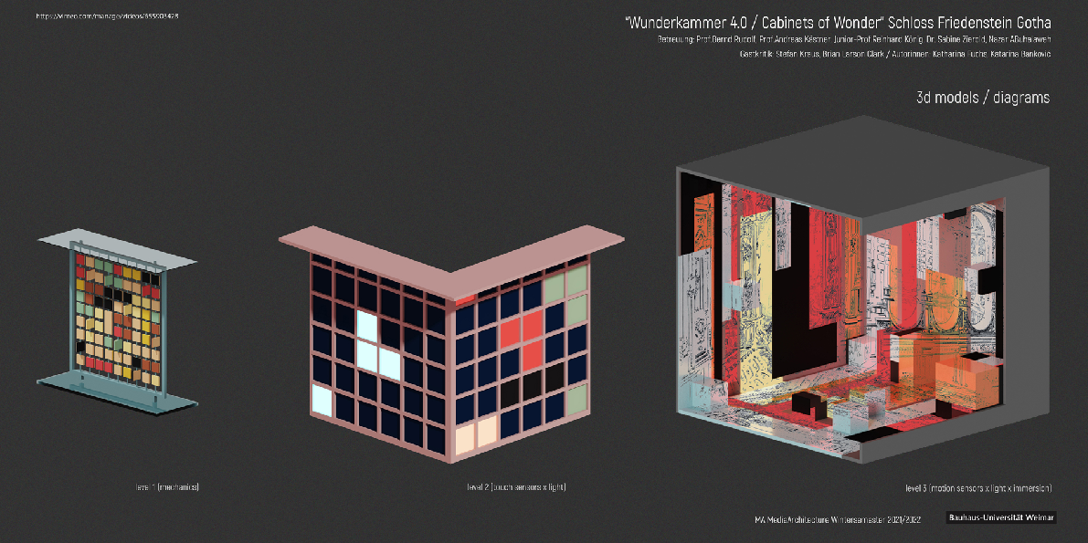 Students analyse the historic exhibitions and design a participative, reactive or interactive spatial-media environment. The micro architecture is referenced to the impromptu design of a “Baroque Artefact” – a baroque art of space and the historic “Wunderkammer” or cabinet of wonder. The modular construction principle of the installation enables a flexible position on different places and to add further elements. The vitrine incorporates changing information about current exhibitions and events and refers to the art collection of Gotha.