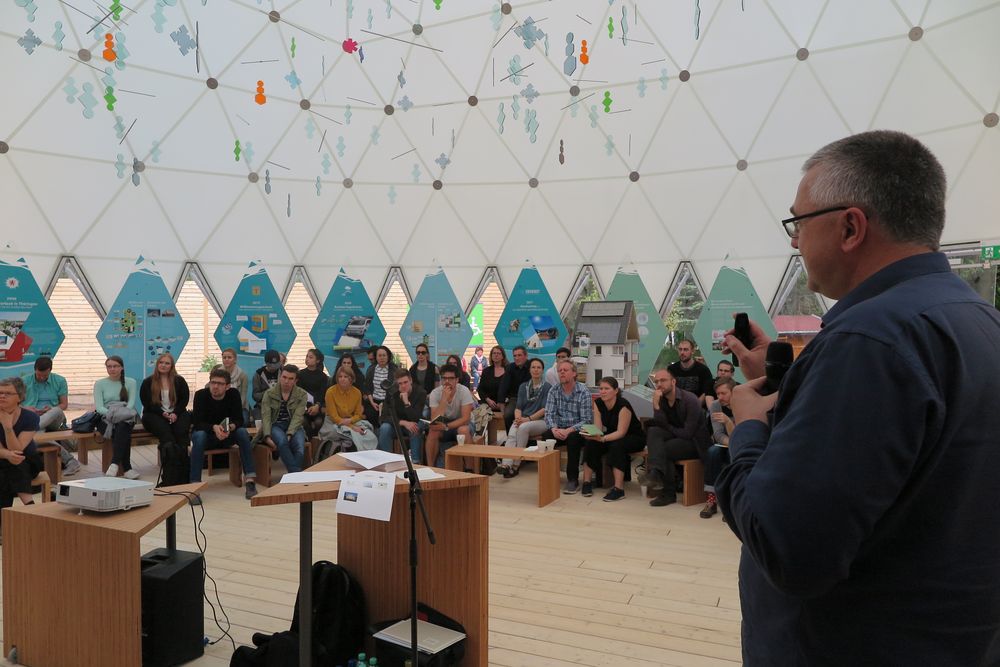 Der Klima-Pavillon, im Auftrag des Thüringer Ministeriums für Umwelt, Energie und Naturschutz auf der Landesgartenschau Apolda errichtet, steht in seiner äußerlich transparent-futuristischen Optik beispielhaft für nachhaltige, alternative Konstruktion und vereint die Prinzipien von Energieeffizienz und minimalem Materialeinsatz mit außergewöhnlicher Ästhetik. Entworfen hat ihn Prof. Dr. Jürgen Ruth, Professor für Konstruktives Entwerfen und Tragwerkskonstruktion an der Bauhaus-Universität Weimar.