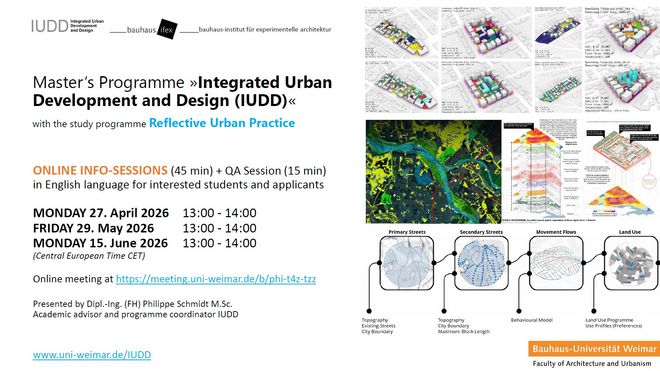 The application deadline for the study Programme »Reflective Urban Practice« (M.Sc.) in the study course »Integrated Urban Development and Design« for applicants having the citizenship status of European Union including Switzerland is until June 25 on the Application Platform https://campusportal.uni-weimar.de. Semester starts on October 1st.