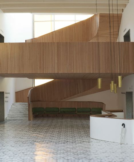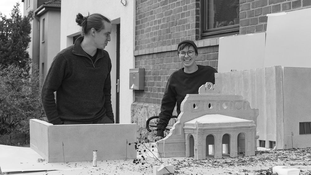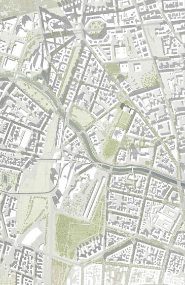 Die beiden Neubauten zitieren nicht nur mit ihrer städtebaulichen Setzung den ehemaligen Bahnhof, auch die Materialität der prunkvollen Stadtfassade wird aufgegriffen und weiterentwickelt. Zum Museumsplatz hin wird das innen liegende Relief des Fragments zum Vorbild, sodass sich alle drei Baukörper dorthin spielerisch öffnen. Die Struktur des Portals wird zum räumlichen Ordnungsprinzip für beide Neubauten. Somit entsteht aus drei Spielern ein Ensemble.