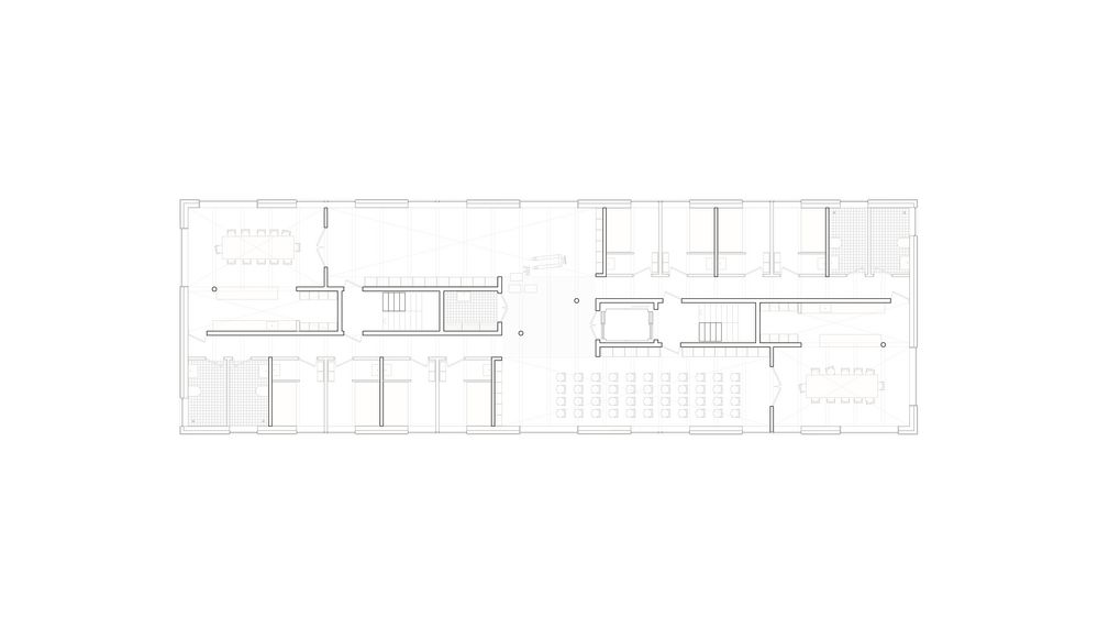 Der erhaltene Gewölbekeller wird zur Kellerei. Über seinen Mauern beherbergt das neue Haus Tätige aus Weinbau und Küchenkultur. Die Konstellation aus bescheidenen Zimmern und großen Gemeinschaftsräumen bestimmt eine enge Verschränkung des temporären Wohnens und Arbeitens.