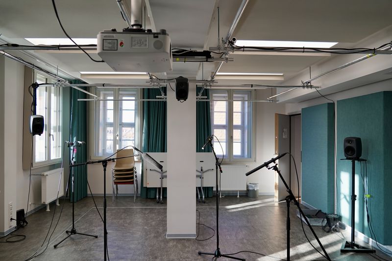 The ProTools Studio in Media House 1 is an editing and mixing station with the additional option of realising 5.1 surround productions with ProTools or Samplitude. Thanks to Avid Artist Mix and Artist Control remote controls with motorised faders, professional surround productions can also be run. Five ME Geithain loudspeakers with subwoofers serve as monitors. In addition to various common plug-ins for sound processing, the workstation also has the Spatial Audio Designer from New Audio technology. Simulations of real as well as virtual loudspeaker arrangements and studio rooms can be listened to on headphones. This makes it possible to create 3D mixes for industry standards such as IMAX, 2+2+2, Auro-3D® or up to 22.2 productions in Pro Tools Studio. There are no limits to sound experiments for radio, film, games, installations, etc.