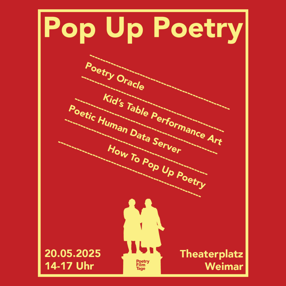 Mit dem Projektmodul »Pop-Up Poetry: Poetische mediale Formate« bringen angehende Künstler*innen und Poesie in den öffentlichen Raum. Studierende präsentieren am Dienstag, 20. Mai 2025, zwischen 14 und 17 Uhr, erste experimentelle Performances und mediale Aktionen im Stadtzentrum Weimars. Dabei spielen auch KI-gestützte poetische Ausdrucksformen eine Rolle.