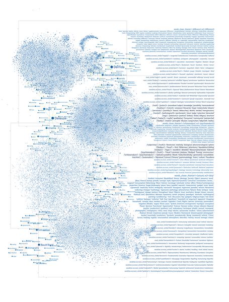 In the work I am going to present, I compare contemporary philosophers by using a machine learning algorithm consisting of a set of language modeling features and learning mechanism in Natural Language Processing (NLP) technique. It is a two-layer neural networks that is trained to reconstruct the linguistic contexts of words. I used an algorithm (Word2Vec) which was created, published and patented by a team of Google researchers in 2013. For this work, I fed the system with the complete body of work of four renown post-structuralist contemporary philosophers: Jacques Derrida, Gilles Deleuze, Jean Baudrillard and Michel Foucault. I employed the genism library’s Word2Vec model to get word-embeddings vectors for each word. Word2Vec is used to compute the similarities between words from a large corpus of text. The algorithm is very good for finding most similar words, or ‘nearest neighbors’, as well as subtracting and adding words. The graphics reduce the dimensions of the Word2Vec space down to x and y coordinates. The closer the objects are, the more similar they are.
