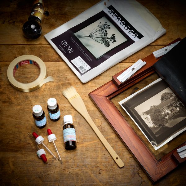 First, we sensitise a paper carrier by applying a light-sensitive chemical solution that we have mixed in advance. Using a contact printing frame modelled on historical examples, we regularly check the intensity of the exposure before developing and fixing the paper under room light.