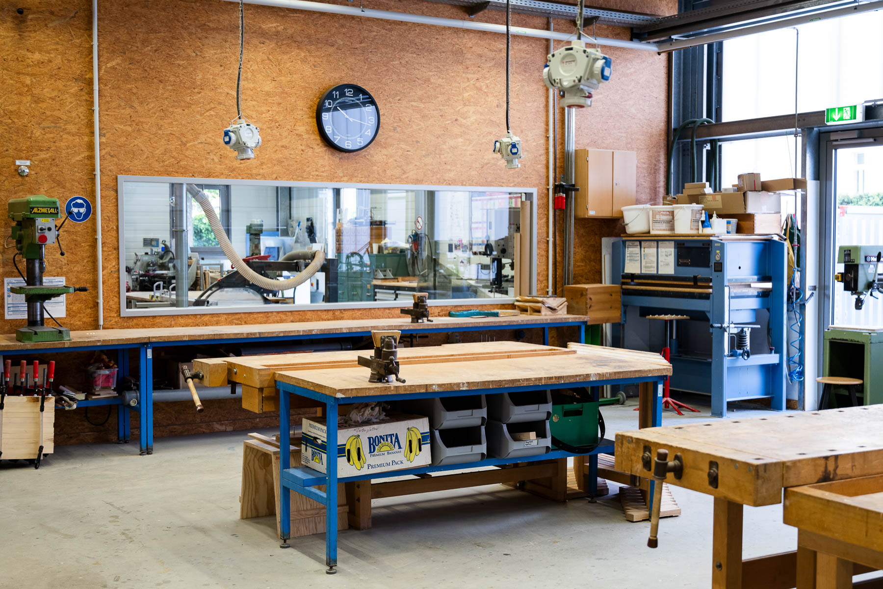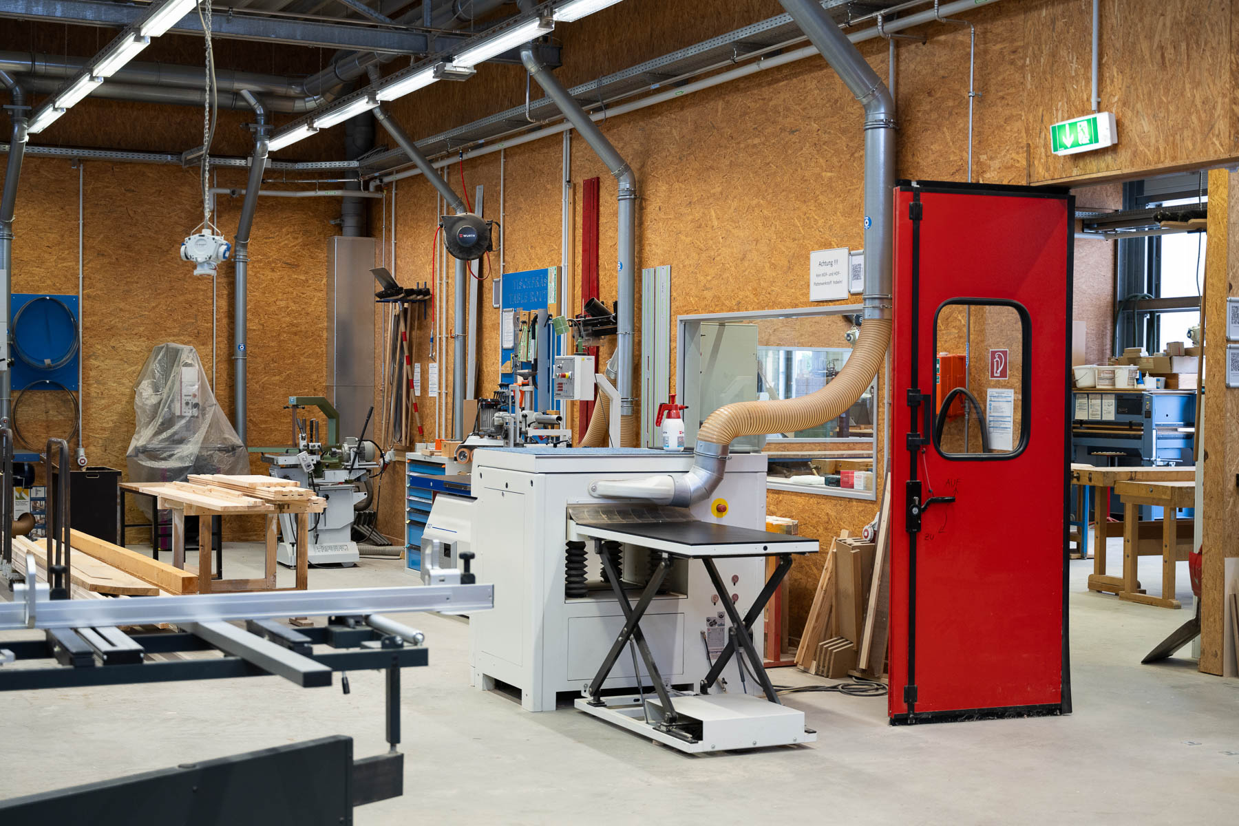 The wood workshop is designed for working with solid wood and panel materials. Eleven workbenches are available for practical work.