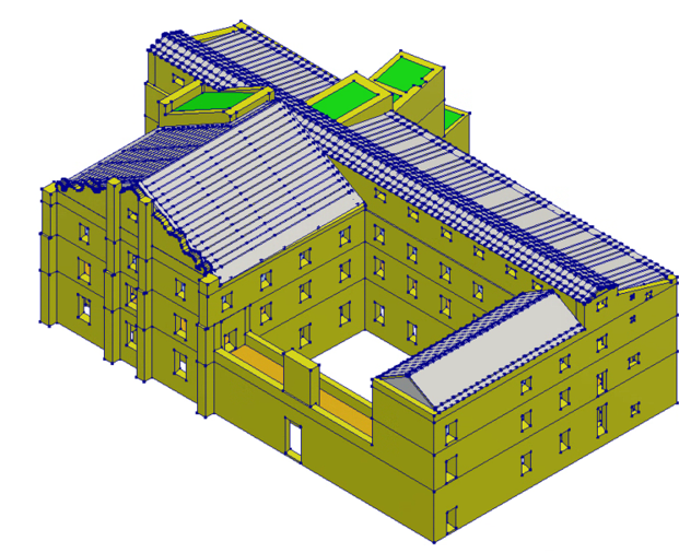 This research addresses the need to assess and enhance the seismic performance of heritage structures through a methodology that is both technically rigorous and conservation-sensitive. The project involves the development and calibration of a detailed finite element model using DIANA FEA. The model incorporates field-based geometric and material data obtained through historical documentation and site inspections. To improve the accuracy of the numerical simulation, calibration is performed using ambient vibration test (AVT) results collected as part of the SesiRiCHerCRO research project. The experimental data provide the building’s fundamental modal frequencies, which are used to fine-tune the stiffness and mass parameters of the numerical model.