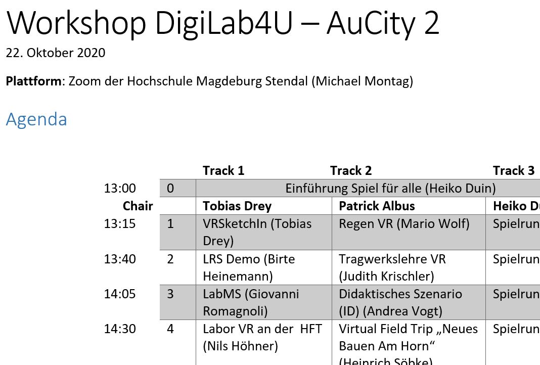 Am 22. Oktober fand ein weiterer Workshop der beiden Projekte DigiLab4U und AuCity 2 statt. Der ursprünglich als Präsenzveranstaltung an der Universität Ulm geplante Workshop wurde Online abgehalten. In mehr als 6 Stunden Online-Zeit wurden in verschiedenen Sessions im Barcamp-Format, strukturiert durch bis zu drei gleichzeitige Tracks, die unterschiedlichen Teilprojekte vorgestellt und angeregt diskutiert. Zu den weiteren Aktivitäten gehört der Play-Test eines in DigiLab4U entworfenen kollaborativen Serious Games sowie die gemeinsame Erarbeitung der Grundlagen eines multikriteriellen Bewertungssystems für digital unterstützte Lernaktivitäten. Die fast alle durchweg anwesenden 20 Teilnehmer des Workshops waren sich einig, dass ein sehr interessantes Programm mit großem Nutzen für beide Projekte abgearbeitet wurde. Neben der Vereinbarung einiger bilateraler Folgeaktivitäten wird jetzt schon die folgenden Workshops mit hohen Erwartungen entgegengesehen – in der Hoffnung, dass diese dann wieder COVID-frei in Präsenz stattfinden können.