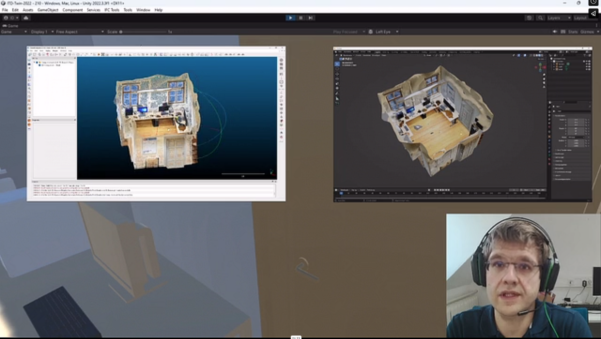 A digital twin represents a connection between a real object and the digital world. The twin consists of a digital model that is automatically updated with data from the real world and also automatically transfers changes from the digital world to the real world. We have created such a twin. In the first step, we integrated the geometry data in the form of the building model, point clouds and meshes into a VR environment.