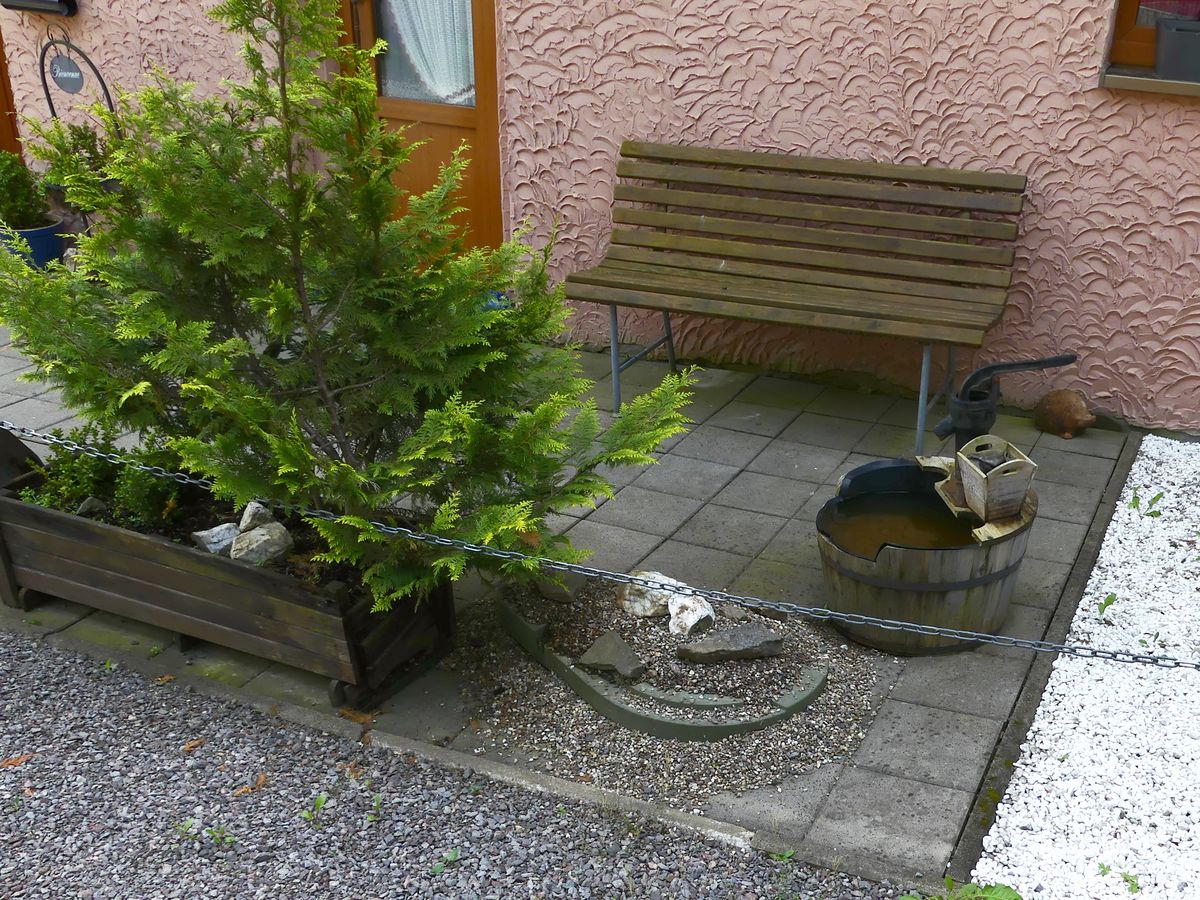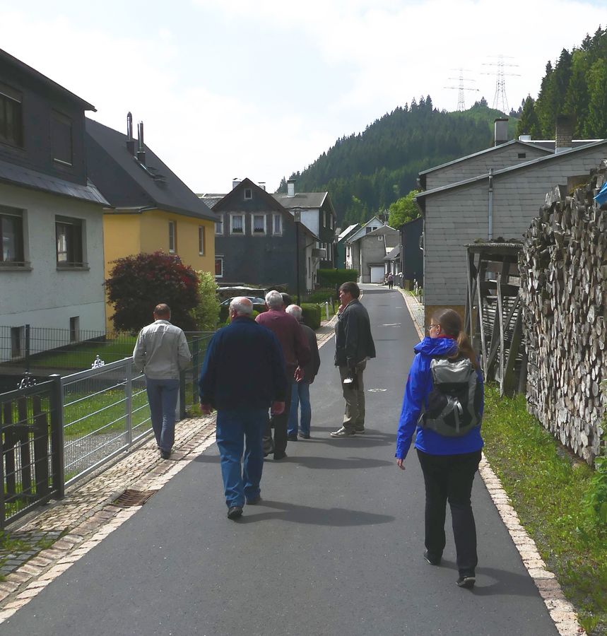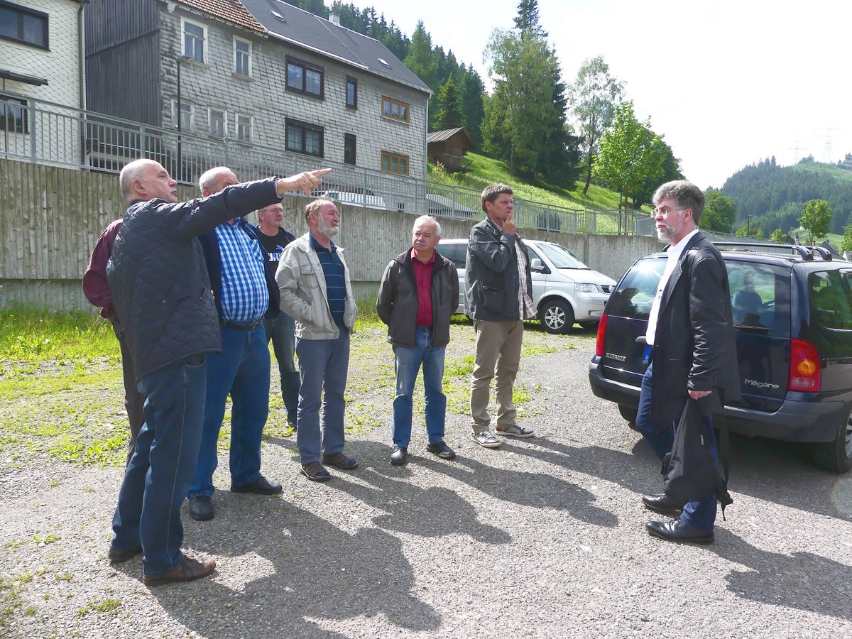 Anschließend erfolgte ein gemeinsamer Rundgang durch den Ort, bei dem die individuellen Installationsmöglichkeiten der Hausanschlussschächte betrachtet wurden. Diese charakterisieren sich durch eine grünliche Abdeckung und waren bei den jeweiligen Grundstücken in den Vorgärten oder Einfahrten sowie neben den Mülltonnen positioniert. Die Bürger aus Rohrbach diskutierten mit den Experten die jeweiligen Möglichkeiten und übertrugen die gewonnen Erkenntnisse direkt auf die örtlichen Voraussetzungen in Rohrbach. Auch ein Gespräch mit zwei Einwohnern ergab sich, die von ihren anfänglichen Bedenken hinsichtlich der Funktionalität und Finanzierbarkeit der Anlage berichteten. Diese haben sich jedoch als unbegründet herausgestellt und so sind sie bis heute von der Anlage vollkommen überzeugt. Abgeschlossen wurde die Exkursion von einer kleinen kulinarischen Stärkung auf dem Freisitz des ortsansässigen Imbiss, die Raum für weitere informative Gespräche und Fragen bot.