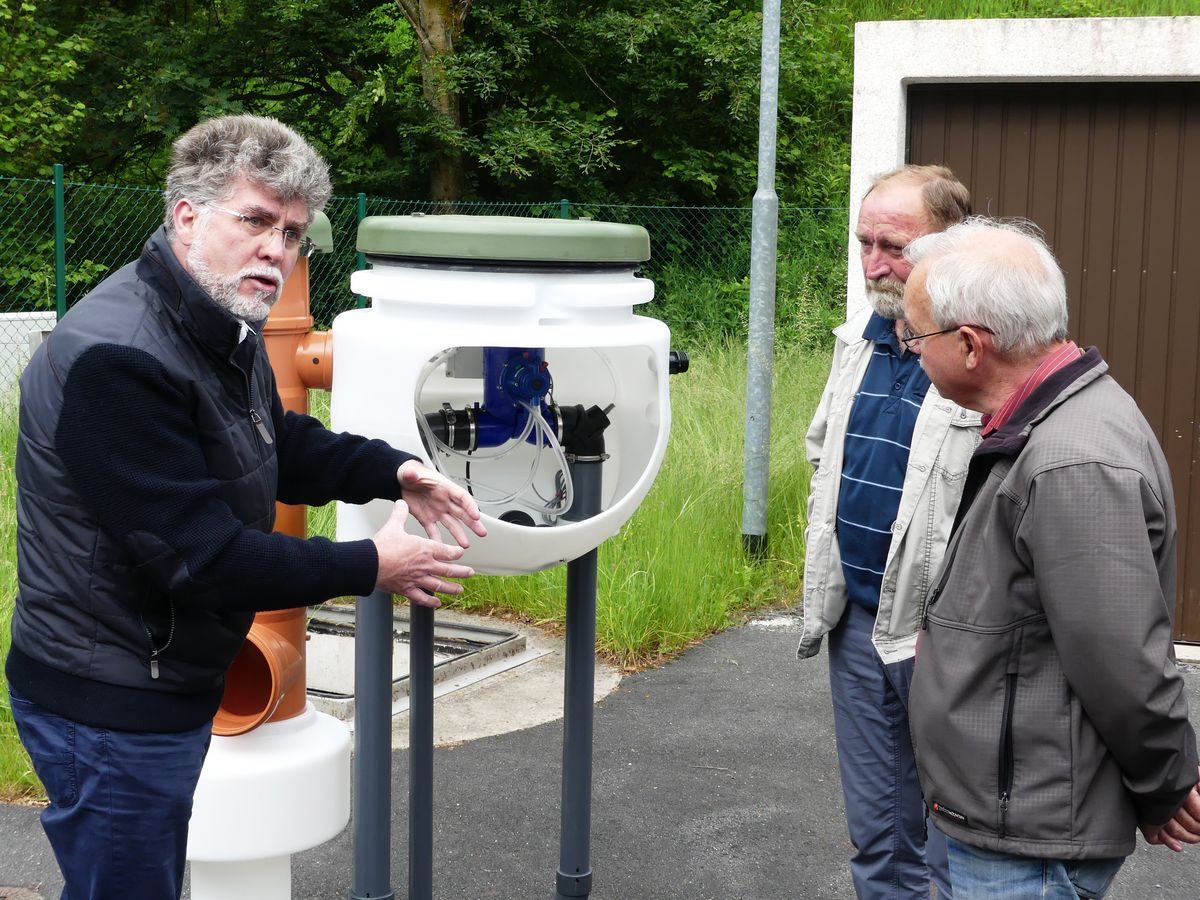 Ausgangspunkt der Exkursion war die Abwasserbehandlungsanlage am Ortseingang von Goldisthal, wo Herr Eisenhardt, der damalige leitende Ingenieur, und Herr Haseloff, von der Firma Bilfinger Water Technologies, die sechs Bürger aus Rohrbach willkommen hießen. Als Einführung skizzierte Herr Haseloff auf einer theoretischen Ebene die allgemeine Funktionsweise der Vakuumentwässerungsanlage. Anschließend lag der Fokus seiner Ausführungen auf den Anschlussmöglichkeiten in den Gebäuden. Mit Hilfe eines aufgebauten Modells, der im Hausanschlussschacht für eine Vakuumentwässerungsanlage essentiell zu installierenden Systemkomponenten der Firma Bilfinger Water Technologies, erklärte er diese sehr anschaulich. Ebenso wurden die in Rohrbach erforderlichen individuellen Installationsmöglichkeiten vorgestellt. Herr Eisenhardt ergänzte die Ausführungen durch seine Erfahrungswerte bei der Implementierung und dem späteren Betrieb der Vakuumentwässerung in Goldisthal, die bereits auf eine 15 jährige Geschichte zurückblicken kann. Auch die Vorteile der konzipierten Vakuumentwässerung schilderte er detailliert im Kontrast zu einer konventionellen Freispiegelentwässerung und verwies argumentativ auf die geographischen und demographischen Gegebenheiten. Die Bürger Rohrbachs lauschten interessiert und erweiterten die Diskussion durch zahlreiche fachspezifische Fragen. Diese betrafen hauptsächlich die Zuverlässigkeit verschiedener Systemkomponenten im Hausanschlussschacht und die daran anknüpfenden finanziellen Aspekte. Letztendlich wurde die Vakuumtechnikanlage in dem nebenstehenden Gebäude vorgestellt, wobei die Teilnehmer von der Schlichtheit der Technik und des Gebäudes überrascht waren.