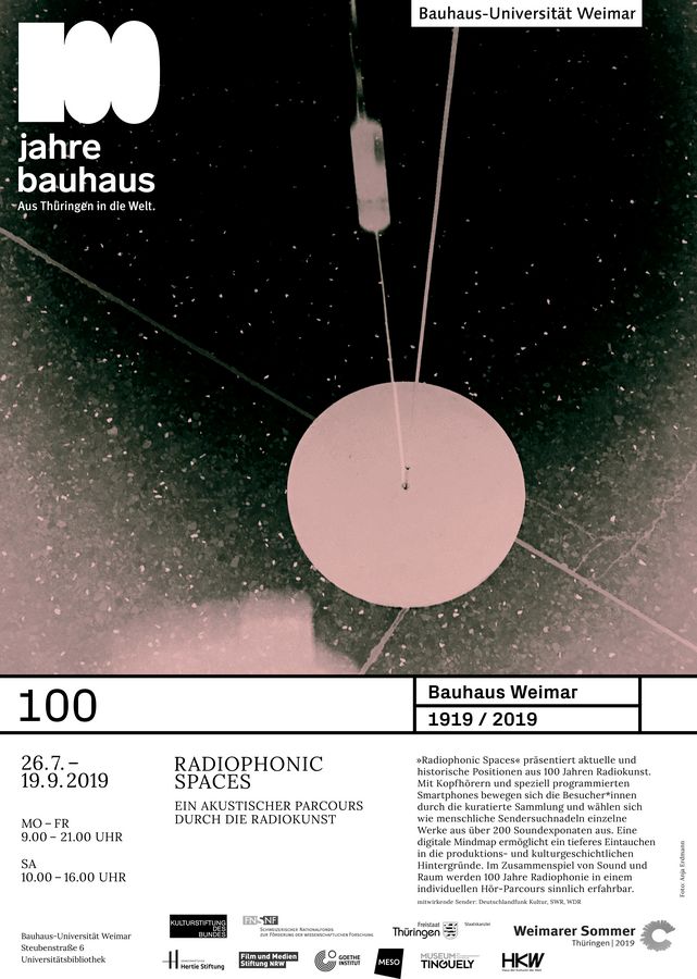 Radiophonic Spaces is a project of the Chair of Experimental Radio at the Bauhaus-Universität Weimar in cooperation with the Museum Tinguely and the Haus der Kulturen der Welt (HKW). Funded by the German Federal Cultural Foundation, Swiss National Science Foundation, State Chancellery of Thuringia, Hertie Foundation, Film- und Medienstiftung NRW, Goethe-Institut as well as Hanna and Dieter Paulmann. It has emerged from the interdisciplinary research project »Radiophonic Cultures – Environments and Archives in Hybrid Media System«.