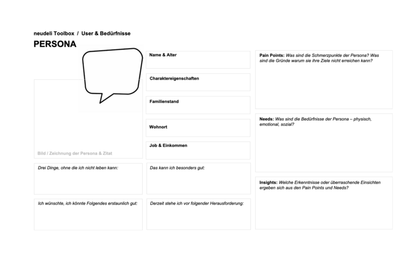 7) Optional: Ergänzt weitere Felder im Persona-Template, die für euer Vorhaben von Relevanz sind und euch bei der Innovationsentwicklung weiterhelfen (z.B. Wie technikaffin ist eure Persona? Welche Apps verwendet sie am häufigsten? Was sind ihre Lieblingsmarken? Was war ihr Traumurlaub?)