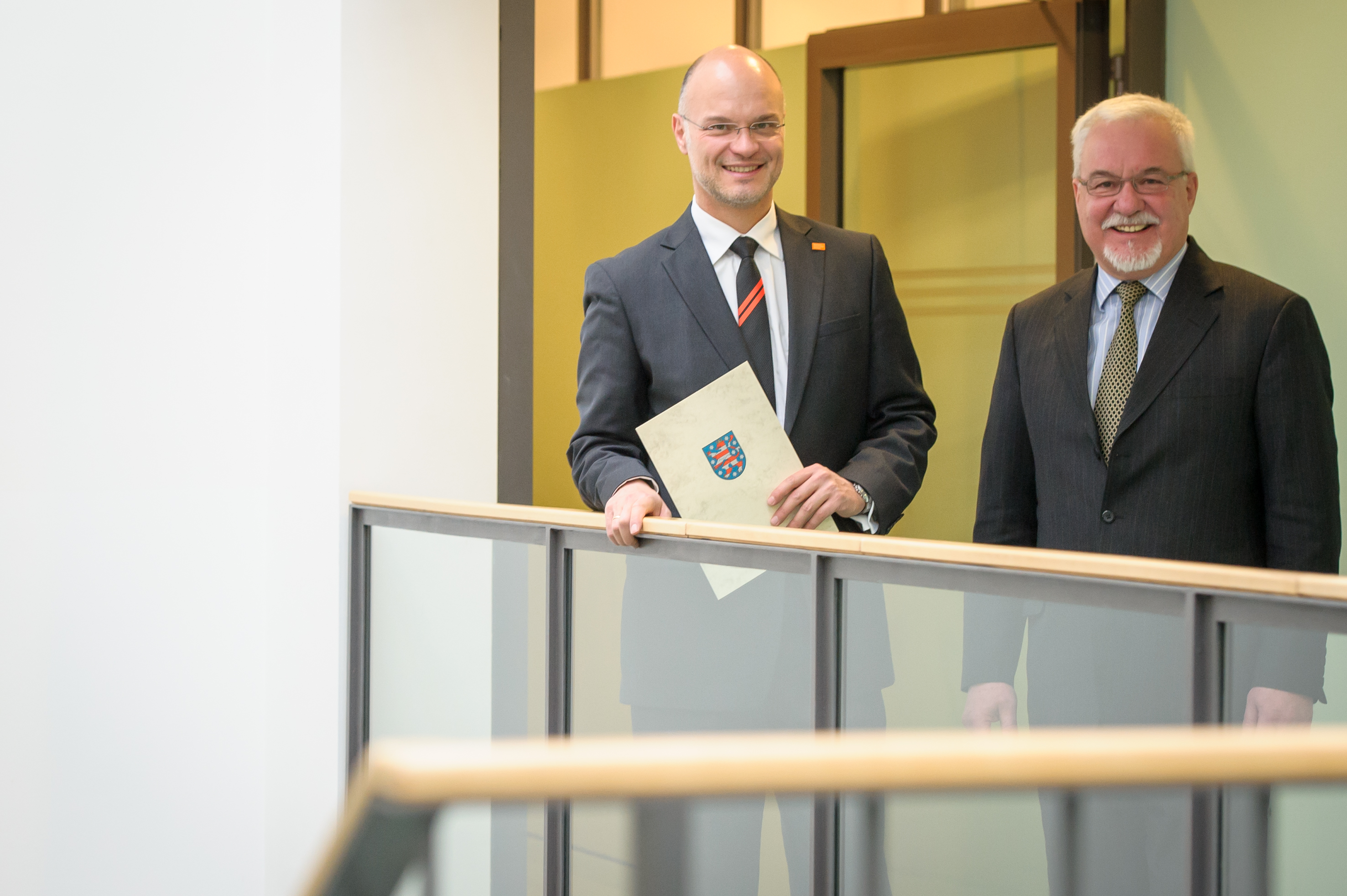 Dr. Henrici is the successor to the long-standing Registrar, Dr. Heiko Schultz. On 4 December 2014 Dr. Henrici was presented with his certificate of appointment at the Thuringian Ministry of Education and Science. He took office this Monday and was sworn in as Registrar of the Bauhaus-Universität Weimar by President (Rector) Prof. Dr.-Ing. Karl Beucke. Immediately thereafter, Dr. Henrici got to work.