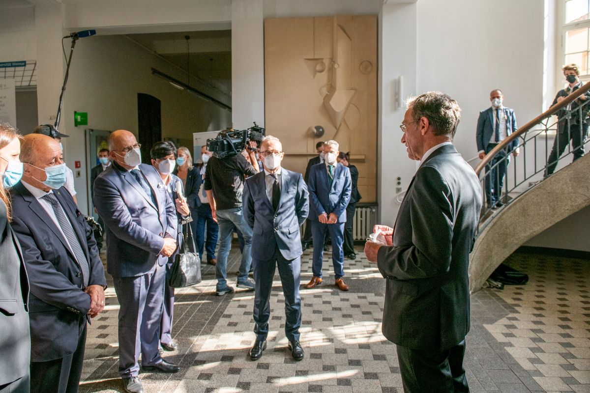 Following this, a work meeting of the three politicians was held on the Bauhaus-Universität Weimar campus. University President Prof. Dr. Winfried Speitkamp welcomed the three ministers in the foyer of the Main Building. In his welcoming speech, he emphasised the critical importance of internationality at this historic site – starting with the Weimar Art School in the 19th century, through the State Bauhaus in the 1920s, and up to today’s Bauhaus-Universität Weimar. Working discussions between Heiko Maas and the other foreign ministers then took place in the Oberlichtsaal.