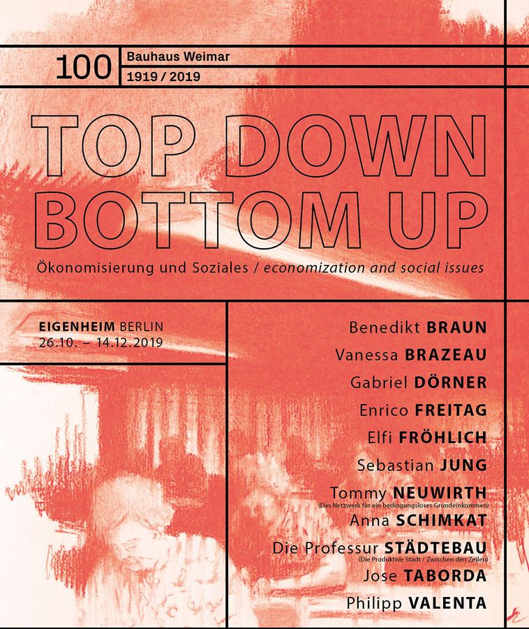 On Saturday, 26 October 2019, the fourth and final exhibition »TOP DOWN / BOTTOM UP – Ökonomisierung und Soziales (Economisation and Social Affairs)« will open at 7 pm at the Berlin branch of Galerie Eigenheim. It will be showcased as part of the »Schaufenster Bauhaus100« series of exhibitions. Students, staff and alumni will be presenting artistic and scientific discussions on the topic.