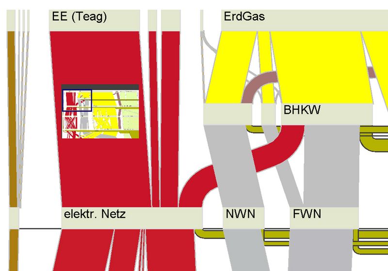Auf dem Weg vom Stromerzeuger zum Nutzer werden Elektrizität, Erdgas oder feste Brennstoffe in Wärme, Licht und mechanische Energie umgewandelt. Dabei geht Energie verloren. Um das Versorgungssystem einer Stadt zu verbessern und die Energieverluste zu minimieren, müssen die Energieflüsse ständig kontrolliert und analysiert werden. Zu diesem Zweck werden Energieflussbilder verwendet, so genannte Sankey-Diagramme. Das Team der Professur Systeme der virtuellen Realität hat ein interaktives Sankey-Visualisierungssystem entwickelt, mit dessen Hilfe Diagramme erstellt und verändert werden können. So ist es möglich, alternative Szenarien virtuell zu untersuchen und etwaige Auswirkungen vorherzusagen.