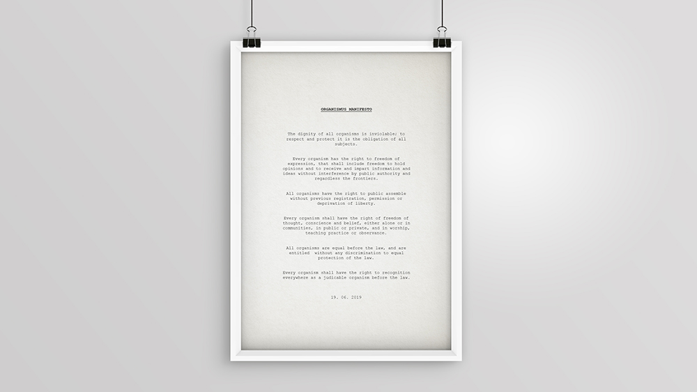 "Organismus Manifesto" is a draft manifest that tries to tackle the controversial use of living organisms in technological and research fields, and presents some controversial points such as organism rights or exploitation. It tries to reflect the possible questions that might arise when using alive organisms in connection to human and computational machines.