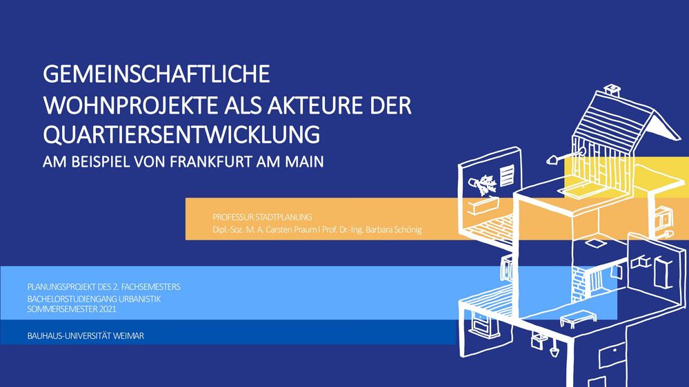 Gemeinschaftliche Wohnprojekte wecken seit jeher eine Vielzahl an wohnungs- und stadtentwicklungspolitischen Hoffnungen. Dabei stehen sie mit ihrem kooperativen Ansatz nicht zuletzt dafür, eine bedeutende Rolle innerhalb der Quartiersentwicklung einnehmen zu können. Demzufolge werden gemeinschaftliche Wohnprojekte in vielen Städten gesondert gefördert. So auch in Frankfurt am Main: Hier gelten aufgrund des Baulandbeschlusses aus 2020 erstmals einheitliche und transparente Voraussetzungen für die Entwicklung von Wohnbaulandflächen. In diesem Zusammenhang werden von nun an 15 Prozent der Flächen verbindlich für gemeinschaftliche Wohnprojekte reserviert, deren Vergabe über ein Konzeptverfahren erfolgt. Damit geht bei den involvierten Akteur_innen eine gewisse Euphorie einher; gleichwohl verweist zum Beispiel der Sprecher des Planungsdezernats darauf, dass man in diesem Bereich noch lernen müsse. „Auch bei der Zusammenarbeit mit den Gruppen.“ Vor diesem Hintergrund fragte das Planungsprojekt zunächst, worin genau die bedeutende Rolle von gemeinschaftlichen Wohnprojekten innerhalb der Quartiersentwicklung besteht. Darüber hinaus erfolgte eine vertiefende Auseinandersetzung mit dem neuen Wohngebiet Hilgenfeld, bei dem das Konzeptverfahren bereits Anwendung gefunden hat. Aufbauend auf diesen Erkenntnissen zielte das Projekt schlussendlich darauf ab, tragfähige Konzepte für den Einbezug von gemeinschaftlichen Wohnprojekten als Akteuren der Quartiersentwicklung zu erarbeiten.